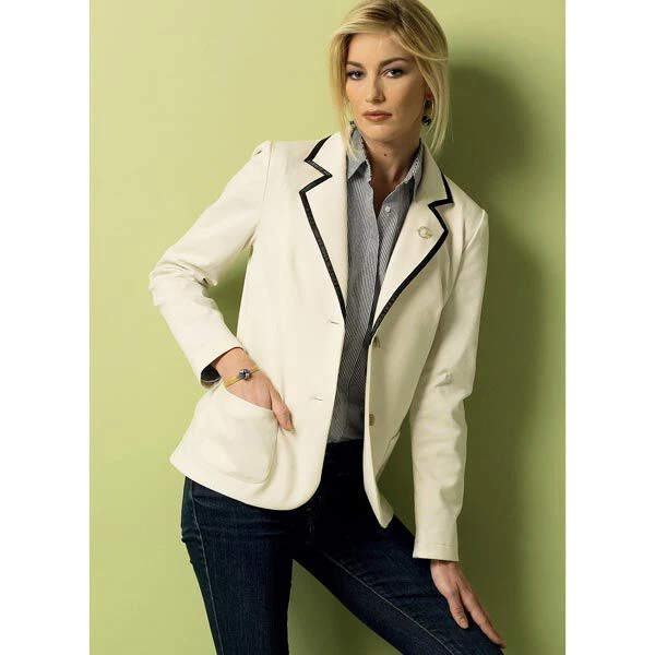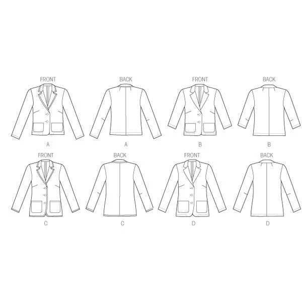 Fitted, unlined jacket has notched collar, patch pockets, French darts and stitched hems. A, C: Purchased trim. A, C, D: Long sleeves. B: Three-quarter sleeves.