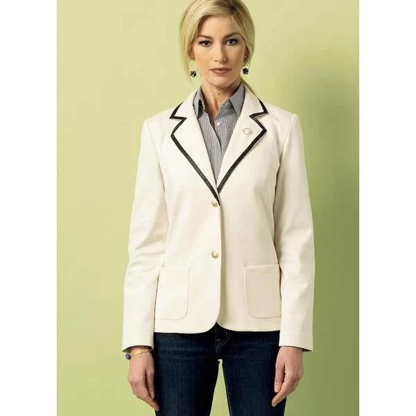 Fitted, unlined jacket has notched collar, patch pockets, French darts and stitched hems. A, C: Purchased trim. A, C, D: Long sleeves. B: Three-quarter sleeves.