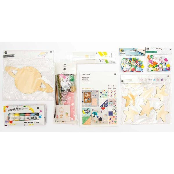 Let your creativity run free! The set contains: Astronaut pattern block, approx. 100-piece animal DIY craft set, Made by Me planet wall charm, Made by Me star wall charm, 6-piece mini home acrylic set, 2-piece kids’ brush set, self-adhesive multicoloured rubber foam numbers, self-adhesive multicoloured rubber foam letters.