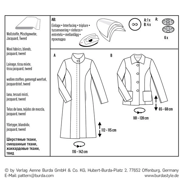 Notions: AB: fusible interfacing; shoulder pads; A: 1 button; 6 sew-on snap fasteners; B: 4 buttons.