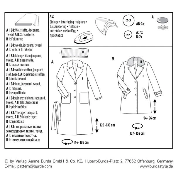 Recommended fabrics: A I, B I: wools, jacquard, tweed, A II: knits, B II: fake fur