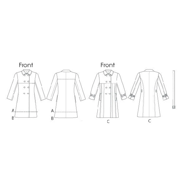 Notions: A,B,C: 1/2″ Covered Shoulder Pads and Ten 1″ Buttons. C: One 2″ Buckle and Two 11/4″ Buckles.