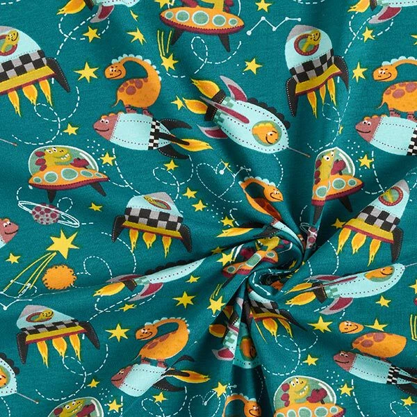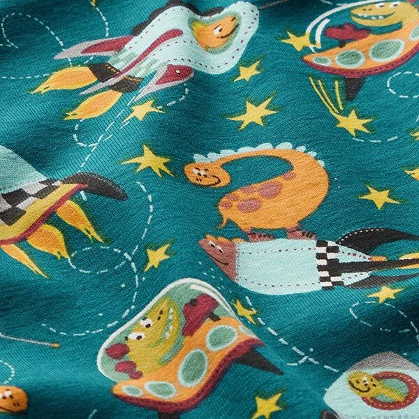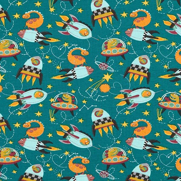Cotton Jersey Dinosaurs In Space – Petrol