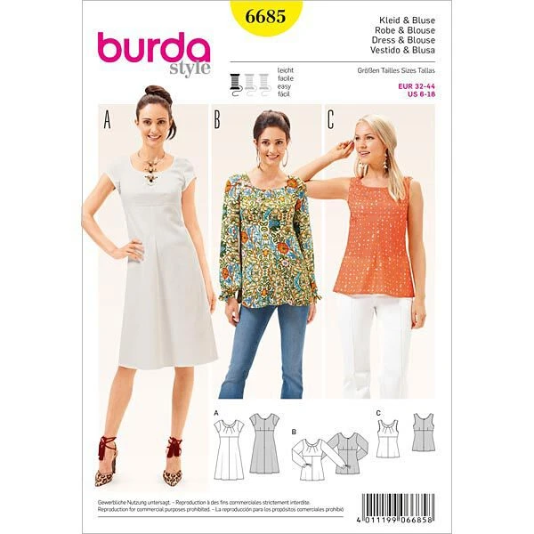 Darts fanning out from the round neckline are a lovely fashion detail on this airy summer dress with a high waist and small sleeves. The blouse and top views B and C are designed likewise. Here you can choose between long sleeves with sleeve bands or simply going sleeveless.