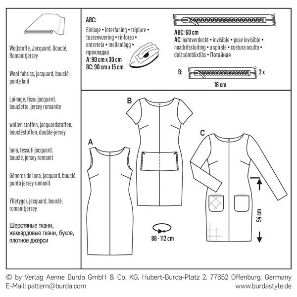 Notions: ABC: Fusible interfacing, 36″ (90 cm) wide: A: 12” (30 cm), BC: 6” (15 cm). AC: Invisible zipper, 24″ (60 cm) long. B: Zippers, 1x 24″ (60 cm) long, 2x 7” (16 cm) long.