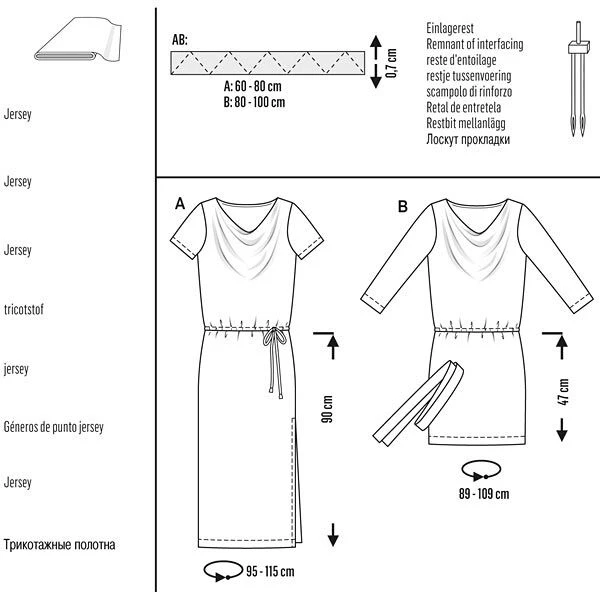 Notions: AB: Elastic, 1/4 in (0.7 cm) wide, A: 3/4-7/8 yd (0.60–0.80 m), B: 7/8 – 1-1/8 yds (0.80–1.00 m). A remnant of interfacing. A twin sewing machine needle.