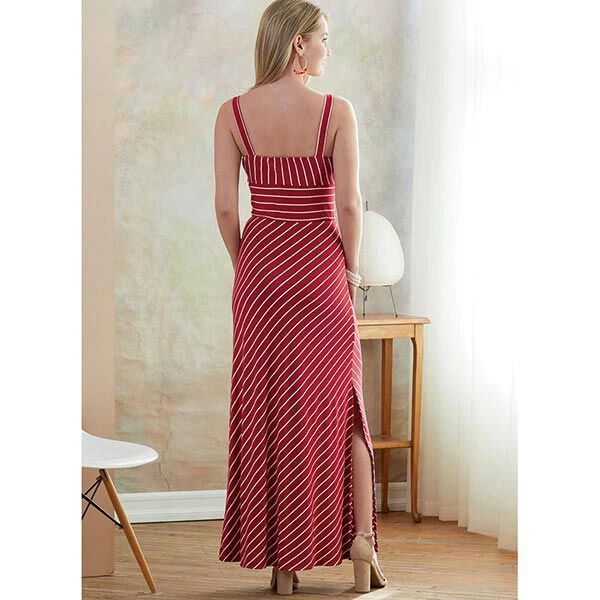 Pullover dress has close fitting bodice with twisted front detail and elasticized back and waist. A:Flared skirt. B: Fitted skirt. C: Skirt with right side slit.