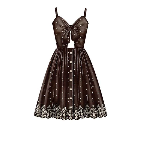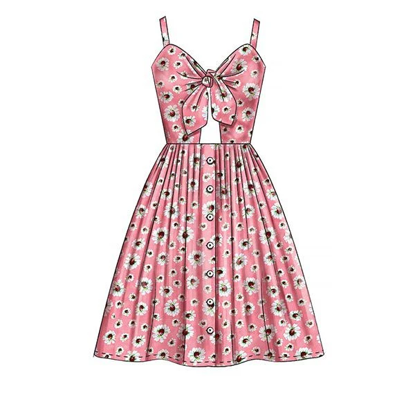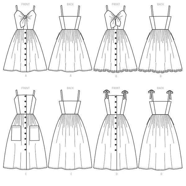 A, B, C, D dress in two lengths is close fitting through the bust, has self faced bodice, slightly flared, gathered skirt, shoulder strap and pocket variation. A, B: Bodice ties in front. A, B, D has side seam pockets. A, B: Mid-knee length. C, D: Lower Calf length.B: Scalloped border print.