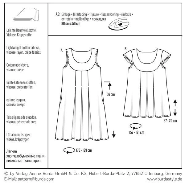 Recommended fabrics: Lightweight cotton fabrics,viscose-rayon, crêpe fabrics