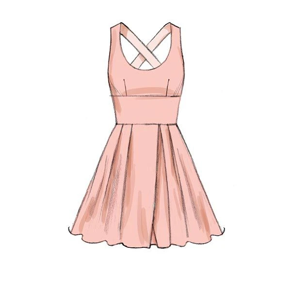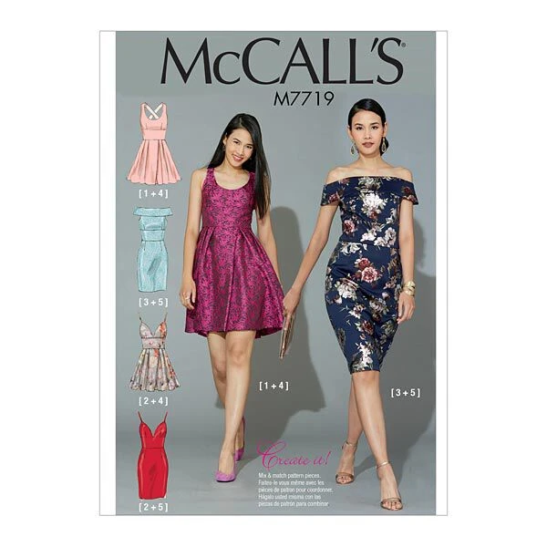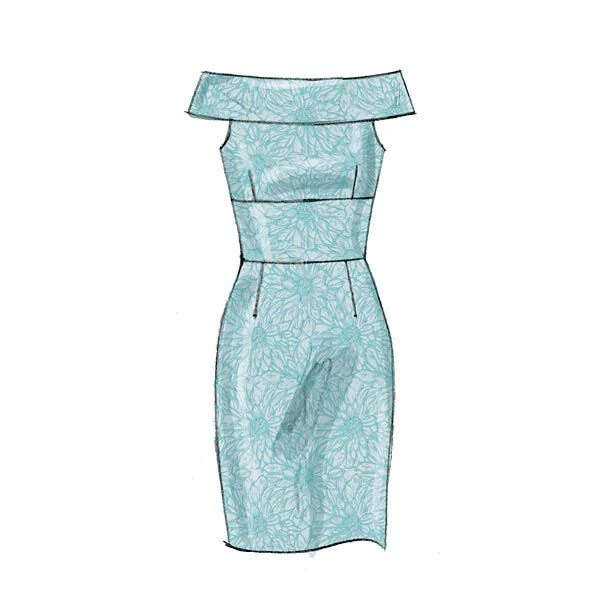Close fitting lined dresses have bodice and skirt variations. Create your own design with mix and match pattern pieces. Design options include: scoop neck bodice, bra bodice, off the shoulder bodice, pleated skirt, and straight skirt.