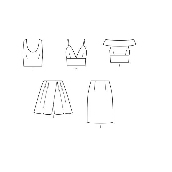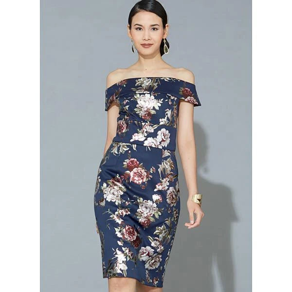 Close fitting lined dresses have bodice and skirt variations. Create your own design with mix and match pattern pieces. Design options include: scoop neck bodice, bra bodice, off the shoulder bodice, pleated skirt, and straight skirt.