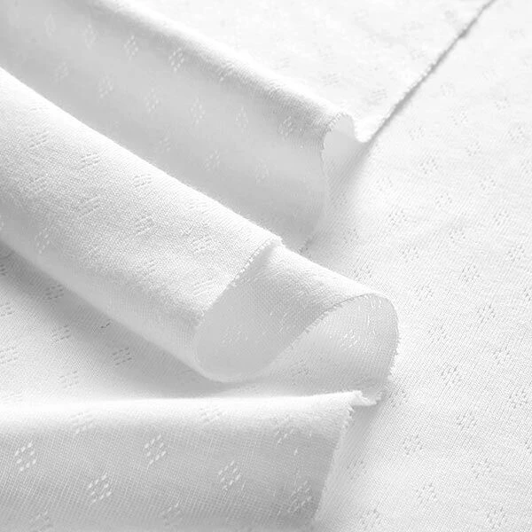 Very soft, finely ribbed cotton jersey fabric with a small ajour rhombus pattern that’s ideal for light tops and underwear.