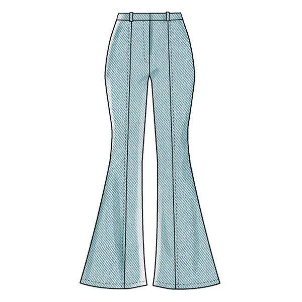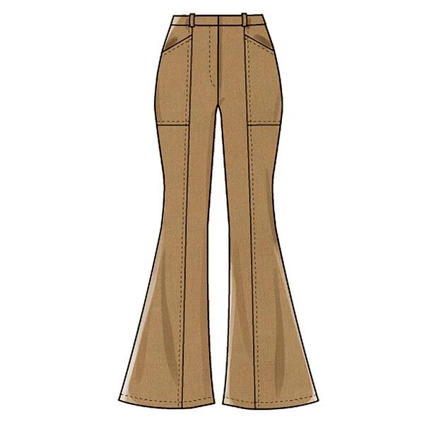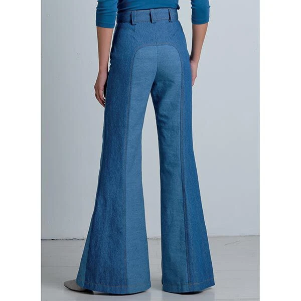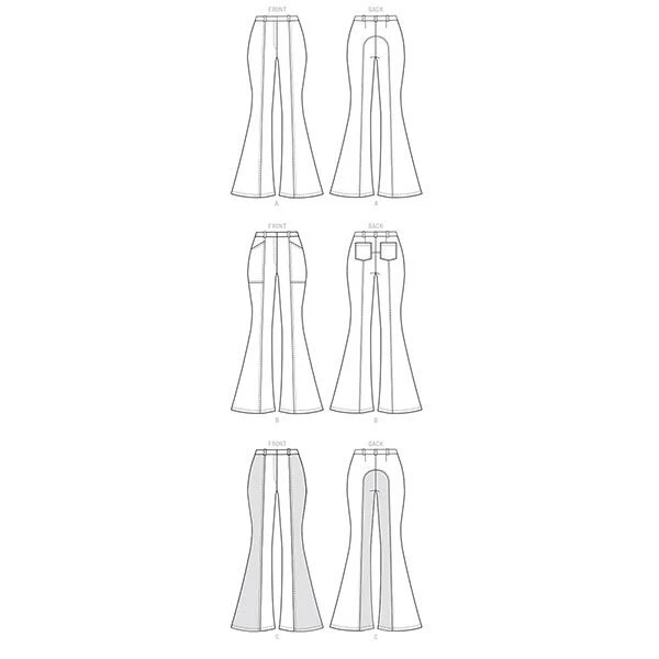 A, B, C has Flared hems, belt carriers and fly front. B: Front and back patch pockets. C: Contrast panels.