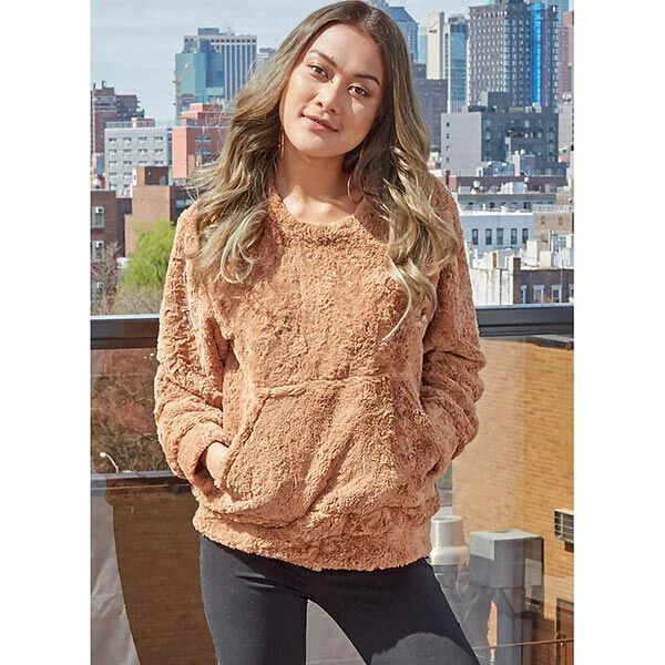 Pullover tops have neck, pocket and trim variations. C: Hood with contrast lining and drawstring and side seam pockets. D: Hood with drawstring, purchased trim and applique. All fit for men’s sizing.