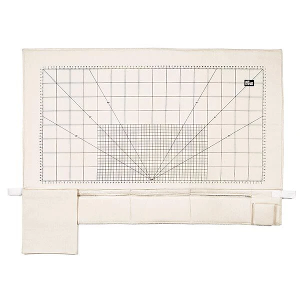 Multi-functional ironing mat with practical storage function. Dimensions: 50 cm x 92 cm With centimetre gauge and angles With loop and bag Pincushion included Removable fabric bag