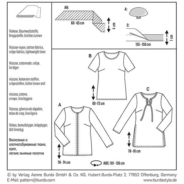 Recommended fabrics: Viscose-rayon, cotton fabrics, crĂȘpe fabrics, lightweight linen