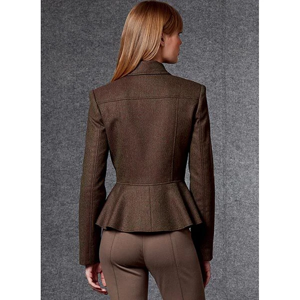 Close-fitting, lined peplum jacket with asymmetrical zipper closure, extended shoulders, shoulder pads, length variations.