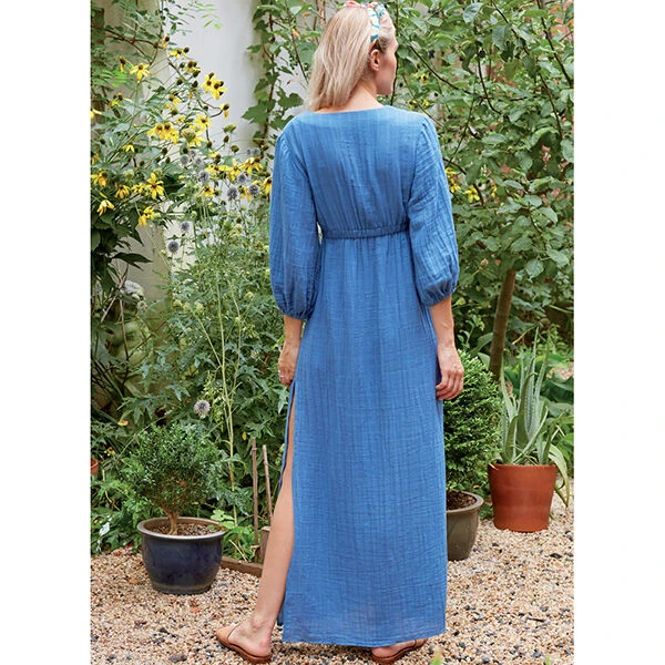 Wrap front bodice, elastic raised waist, tulip and elastic hem puff sleeves. B: hemline ruffle. C: ankle length, side slit.