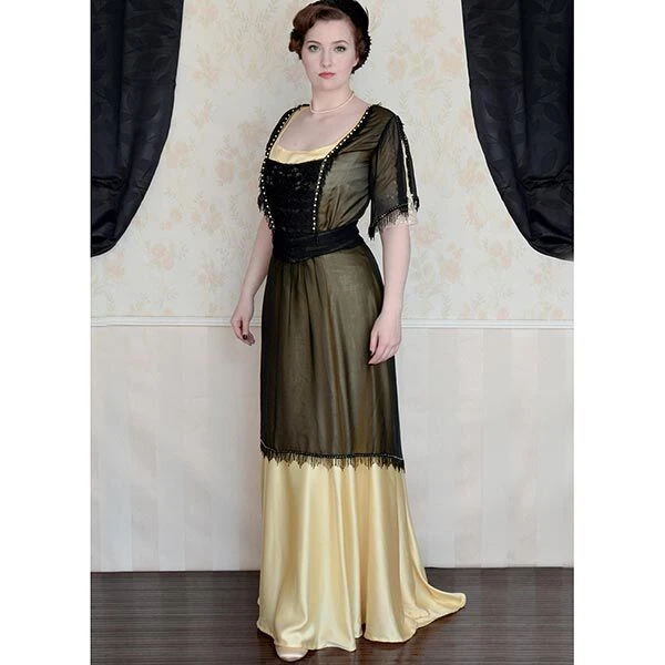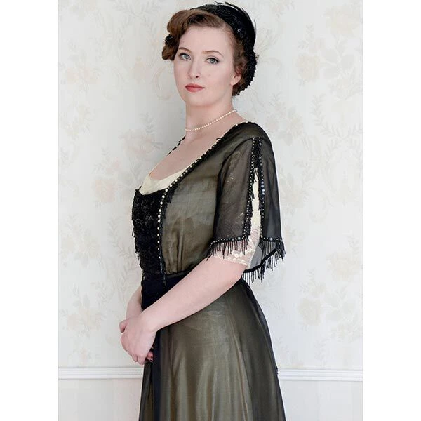 Loose fitting Dress A, with lined bodice, has lace detail on sleeves. Loose-fitting Overdress B, with lined and boned bodice, and skirt, each gathered under shaped midriff, has beaded fringe trim. A and B have hook and eye closures in back.