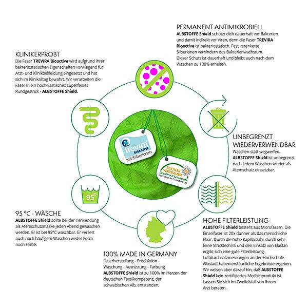 The antimicrobial jersey, consisting of high-tech fibre Trevira Bioactive, is made, processed and printed in Germany by Albstoffe. The fabric is soft, stretchy and perfectly moulds to the face. The fibre Trevira Bioactive is bacteriostatic. Melted into the fibre, silver ions prevent the growth of bacteria. This protection is designed to last and will remain 100% effective even when washed at 60-95°C. Your facemask should always be washed after use.