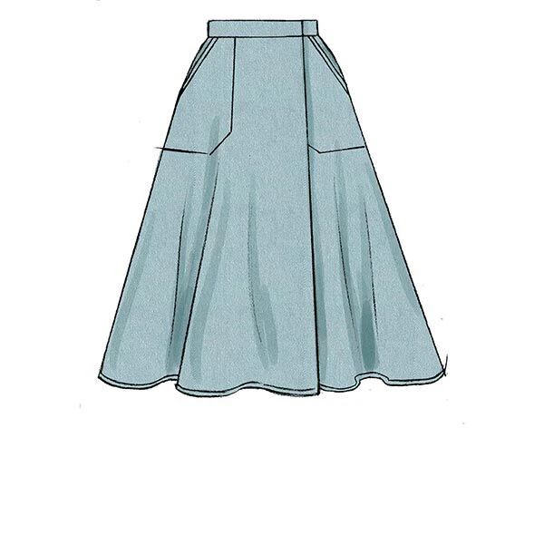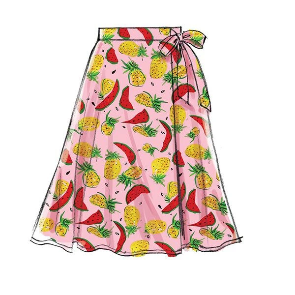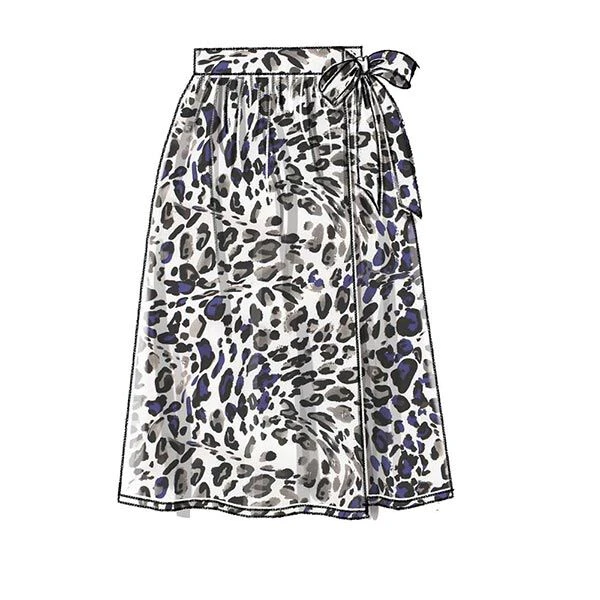 Wrap skirt has length variations with hook and eye closures. A, B, C: Side seam pockets. D: Patch pockets.