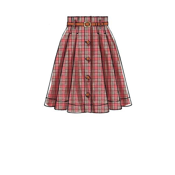 Very full pleated skirts are worn 2″ above the waist and have button front, front and back facings, deep hem and length and carrier variations. A, C: Narrow carriers for purchased belt. D: Wide carriers and self tie belt.