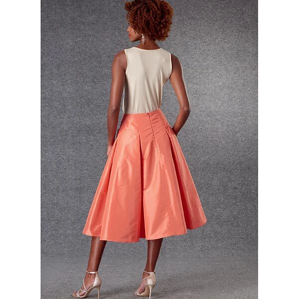 Misses’ flared skirt has yoke detail, faced waist, front pockets, pleat underlays, invisible back zipper, length variations.