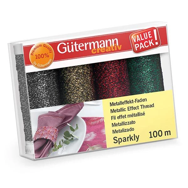 4 x 100m spools of Sparkly in 3 colourways featuring gorgeous sparkling colours. Sparkly is the sewing thread with a trendy metallic look for glittering decorative stitches and decorative topstitching.