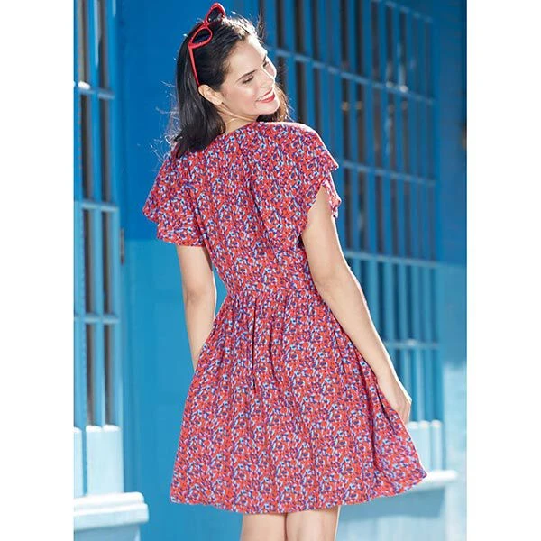 Misses’ elastic waist dress has sleeve and skirt ruffle variations.