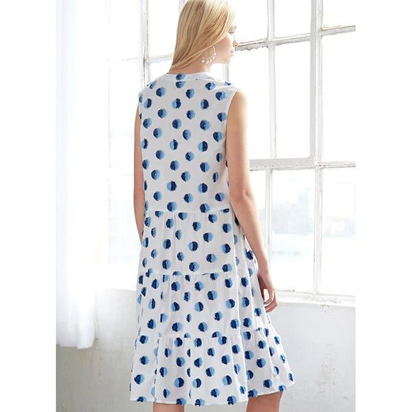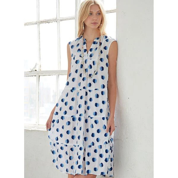 Misses’ loose fitting dress has skirt tiers and sleeve variations. B: Lace trim.