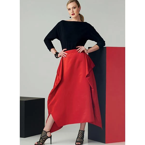 Close-fitting top has dolman sleeves. Skirt has waistband with side draping that forms pockets.