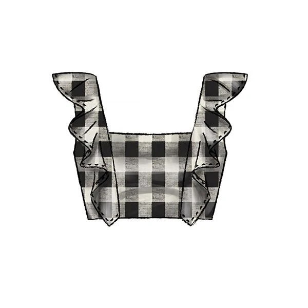 A, B, C close fitting, self lined Tops have princess seams, back separating zipper, is 3″ above normal waist. A: Front casing with drawstrings. B: Flounce: C: Ruffles, sleeve with elastic casing. Shorts D, Pants E have front pleats, side pockets, back yoke. E:Lower calf length.