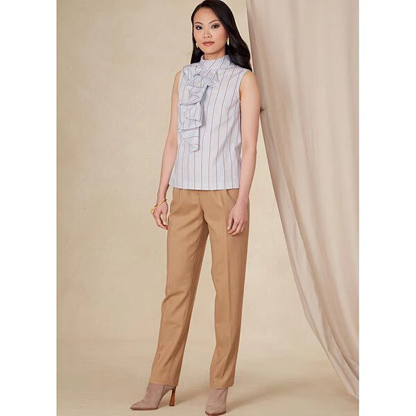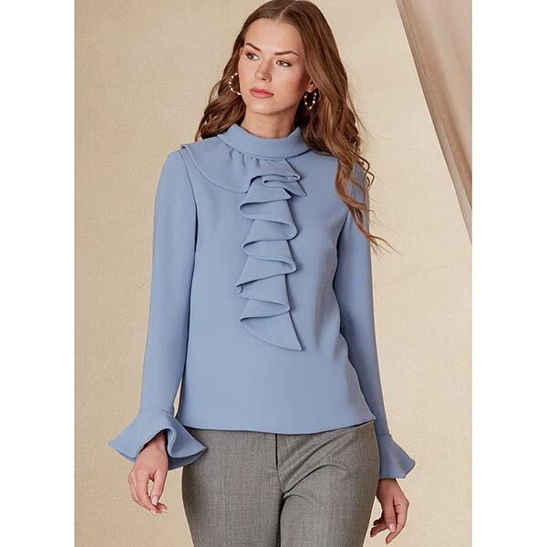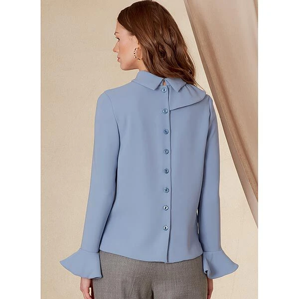 Misses’ and misses’ petite fitted top has bias ruffle detail, bias fold back collar, bust darts, back button closure. A: self bias armhole facings. B: long set-in sleeves ending in flounce. Complete the look with these buttons for view A or these buttons for View B.