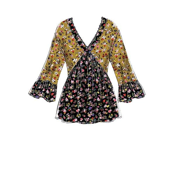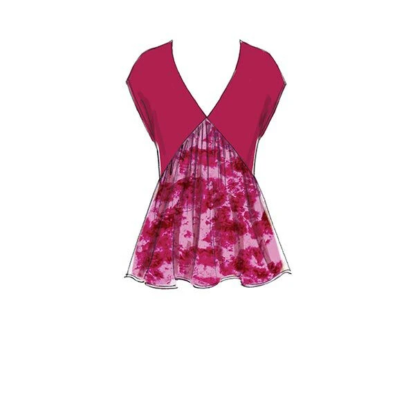 Recommended fabrics: Rayon Blends, Knits, Crepe De Chine, Dobby. Note: Fabric requirement allows for nap, one-way design or shading. Extra fabric may be needed to match design or for shrinkage.