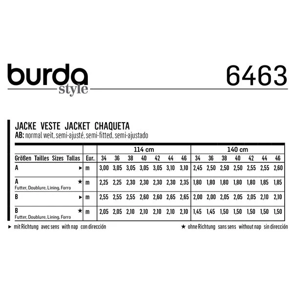 Notions: AB: fusible interfacing; shoulder pads; 1 large button A: 4 smaller button; B: 2 small buttons.
